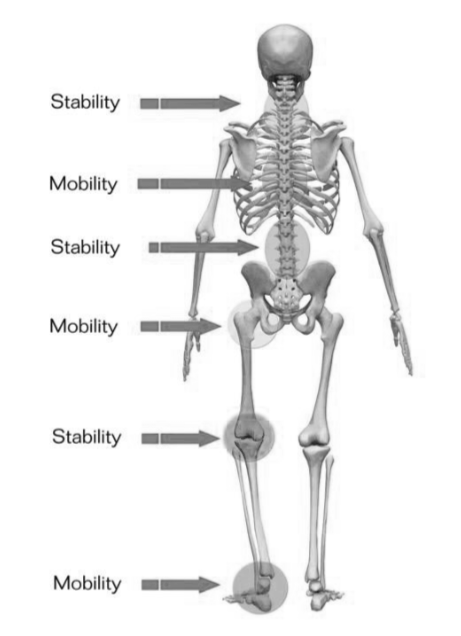 To velja tudi za druge sklepe v našem telesu kot sta stopalni sklep in skapulo-torkalni sklep. Zato je zelo dobro vedeti kateri sklepi v našem telesu naj bodo mobilni in kateri stabilni. To se zelo lep vidi v spodnjem prikazu koncepta Joint-by-Joint, ki sta ga iznašla trener za telesno pripravo Mike Boyle in Gray Cook.